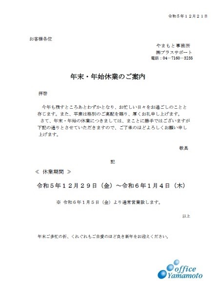 さて、誠に勝手ながら、弊事務所では年末年始の休業日につきまして、下記の通りとさせていただきます。